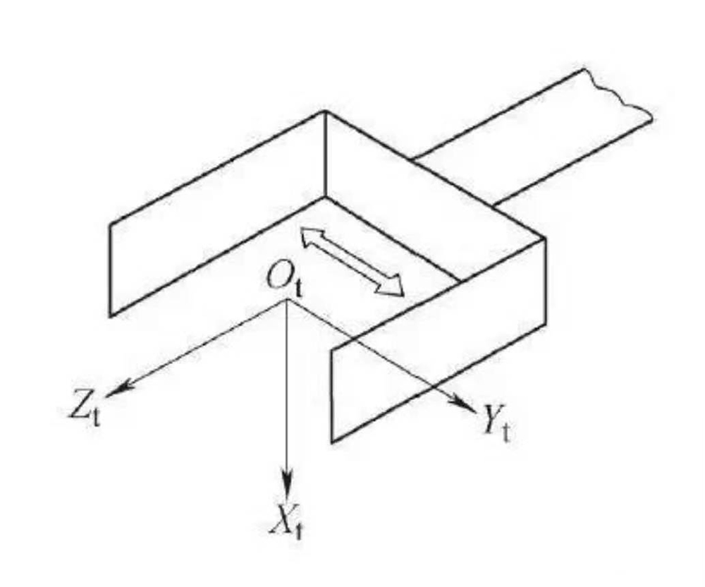 工具坐標(biāo)系以安裝在機(jī)械接口上的末端執(zhí)行器為參照系,符號(hào)為O t、X t、Y t、Z t(見(jiàn)下圖)。原點(diǎn)O t是工具中心點(diǎn)(TCP);+Zt軸與工具有關(guān),通常是工具指向;在平板式夾爪型夾持器夾持時(shí),+Y t是手指運(yùn)動(dòng)平面的方向。