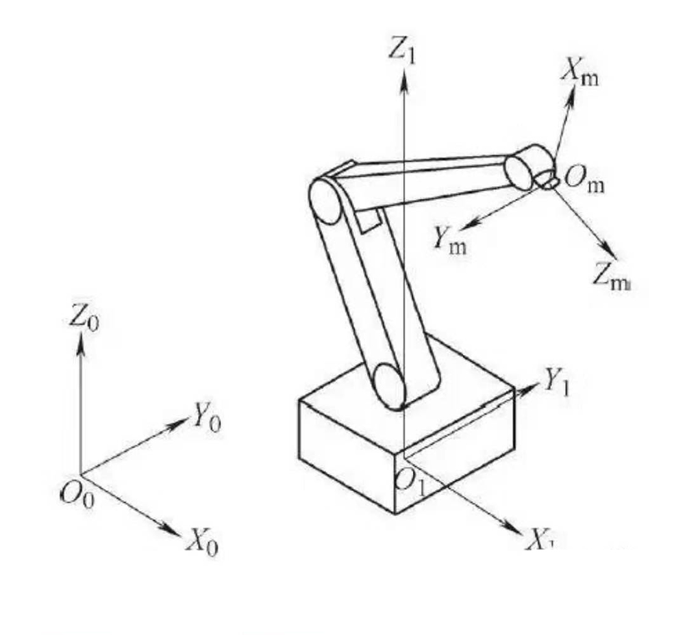 機(jī)械接口坐標(biāo)系是以機(jī)械接口為參照系,符號(hào)為O m、X m、Y m、Z m(見(jiàn)上圖右)。原點(diǎn)O m是機(jī)械接口的中心;+Z m軸的方向垂直于機(jī)械接口中心,并由此指向末端執(zhí)行器;+X m軸由機(jī)械接口平面和X 1、Z 1平面的交線(xiàn)來(lái)定義,同時(shí)機(jī)器人的主、副關(guān)節(jié)軸處于運(yùn)動(dòng)范圍的中間位置。當(dāng)機(jī)器人構(gòu)造不能實(shí)現(xiàn)此約定時(shí),應(yīng)由制造廠(chǎng)規(guī)定主關(guān)節(jié)軸位置。+X m軸的指向遠(yuǎn)離Z 1軸。