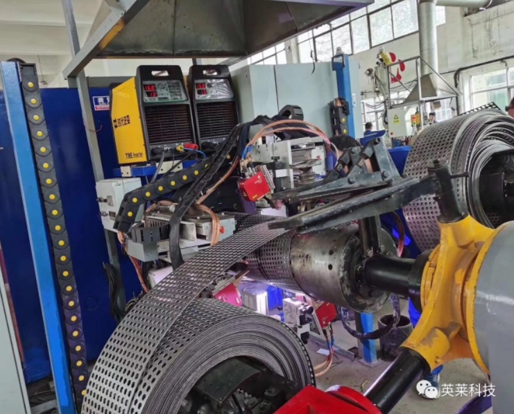 孔網(wǎng)鋼帶復(fù)合管骨架是由薄鋼板為基材沖孔而成,產(chǎn)品規(guī)格不同,鋼板厚度、寬度也不同。由于孔網(wǎng)鋼帶復(fù)合管生產(chǎn)線較長,且均為連續(xù)生產(chǎn),焊接生產(chǎn)線多采用纏繞成型的方案。