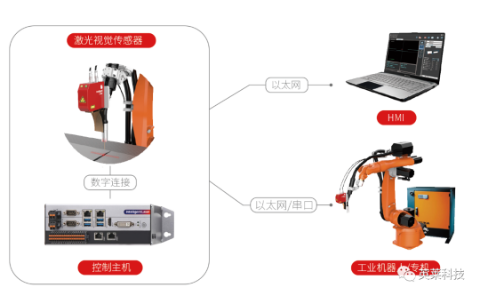 激光視覺焊縫跟蹤系統(tǒng)由焊縫跟蹤傳感器及控制主機組成,傳感器負責(zé)焊縫信息的主動采集,控制主機負責(zé)焊縫信息的實時處理,并與工業(yè)機器人或焊接專機保持實時通訊,讓工業(yè)機器人或焊接專機實現(xiàn)焊縫尋位、焊縫實時跟蹤的功能,識別焊縫偏移矯正焊接軌跡,實現(xiàn)真正的智能化焊接。