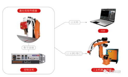 激光視覺焊縫跟蹤系統(tǒng)由焊縫跟蹤傳感器及控制主機(jī)組成,傳感器負(fù)責(zé)焊縫信息的主動采集,控制主機(jī)負(fù)責(zé)焊縫信息的實(shí)時處理,并與工業(yè)機(jī)器人或焊接專機(jī)保持實(shí)時通訊,讓工業(yè)機(jī)器人或焊接專機(jī)實(shí)現(xiàn)焊縫尋位、焊縫實(shí)時跟蹤的功能,識別焊縫偏移矯正焊接軌跡,實(shí)現(xiàn)真正的智能化焊接。