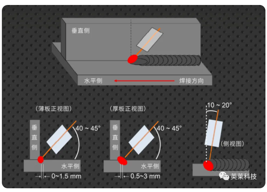 根據(jù)工件厚度,角焊縫可分為單焊道和多層道。單焊道大焊腳高度7~8mm,多層焊適用于8mm以上的焊腳。因后退法余高過(guò)高,作業(yè)性能差,氣保效果不好,因此水平角焊宜采用前進(jìn)法進(jìn)行焊接。