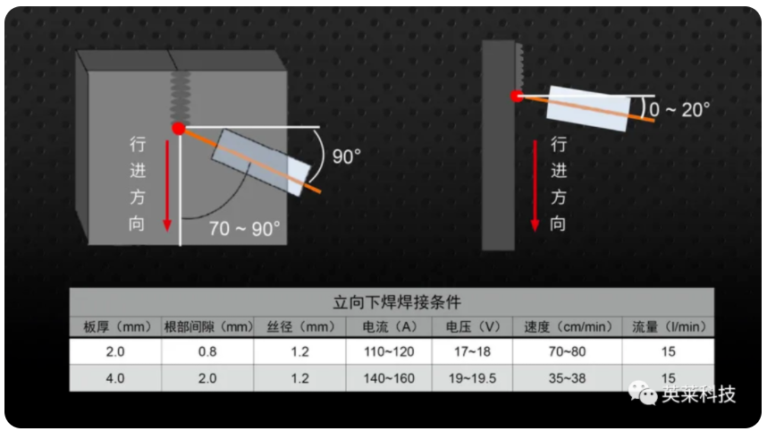 立向下焊關(guān)鍵是控制熔池不下淌,防止發(fā)生焊瘤和焊不透。