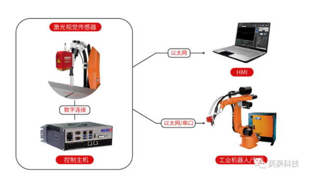 英萊激光視覺焊縫跟蹤系統(tǒng)就像工業(yè)機(jī)器人的雙眼,通過激光傳感器主動采集焊縫信息,控制主機(jī)快速完成數(shù)據(jù)分析,引導(dǎo)機(jī)器人補(bǔ)償實(shí)際焊縫與示教軌跡的偏差,實(shí)現(xiàn)精準(zhǔn)焊接: