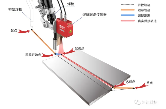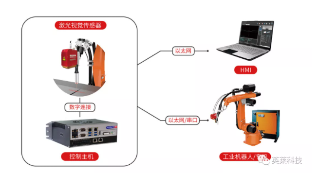 英萊激光視覺(jué)焊縫跟蹤系統(tǒng),類(lèi)似工業(yè)機(jī)器人的雙眼,通過(guò)激光傳感器實(shí)時(shí)采集焊縫信息,系統(tǒng)可引導(dǎo)機(jī)器人補(bǔ)償實(shí)際焊縫與示教軌跡的偏差,讓機(jī)器人實(shí)現(xiàn)精準(zhǔn)焊接。